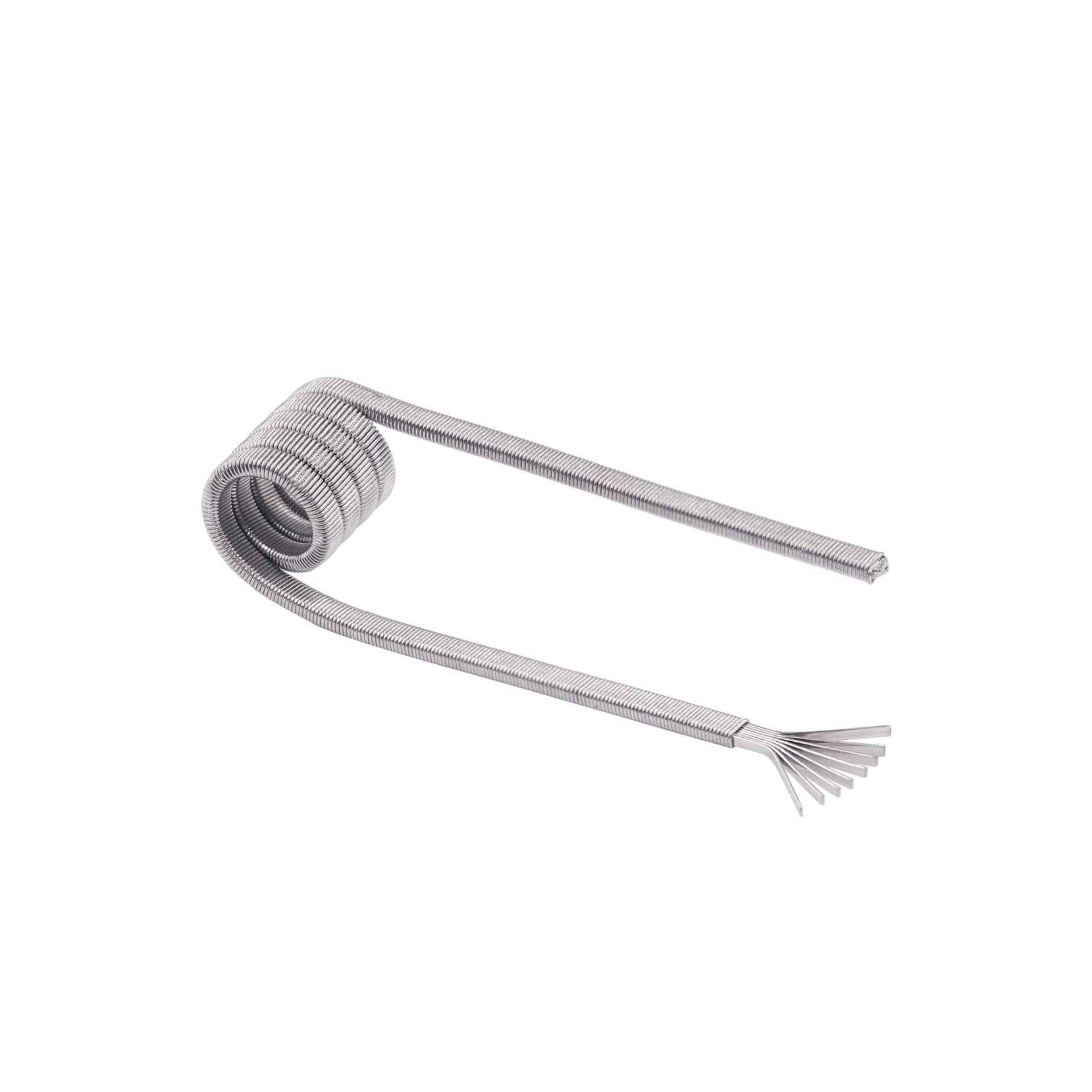 The staple coil is a 8 ply ribbon wire wrapped with 36ga wire.This variation of the fused Clapton has a quicker ramp-up time due to the stacked ribbon cores. The tiny grooves in between the wraps trap e-juice and contribute to its enhanced flavor.
